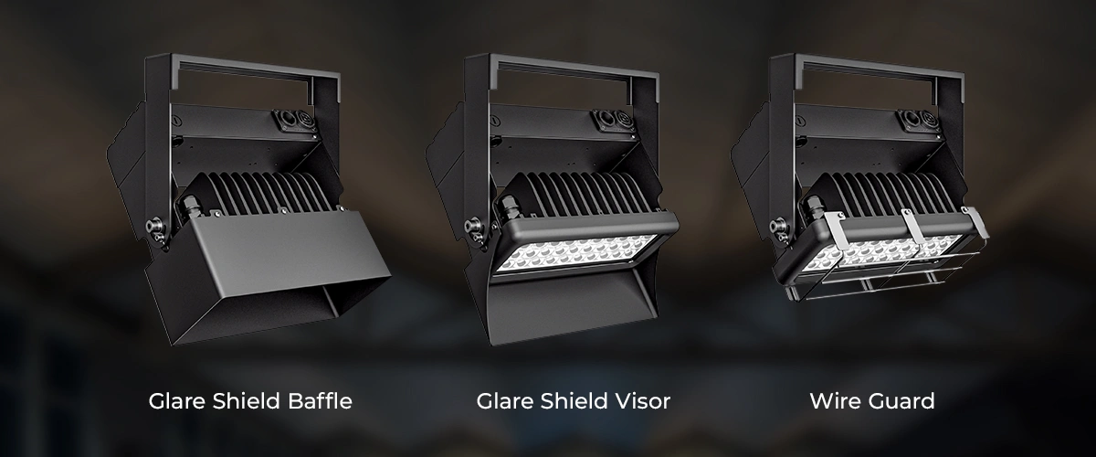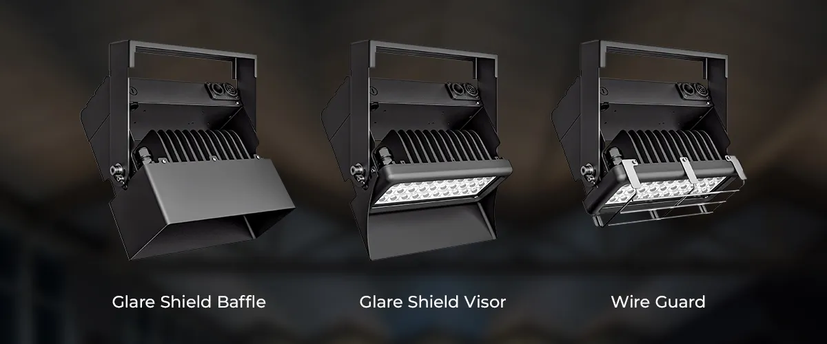Optional accessories enhance Bolt Mini’s usability and protection. Glare shields help control light spill, while a wire guard provides added safety in active work and stage environments.